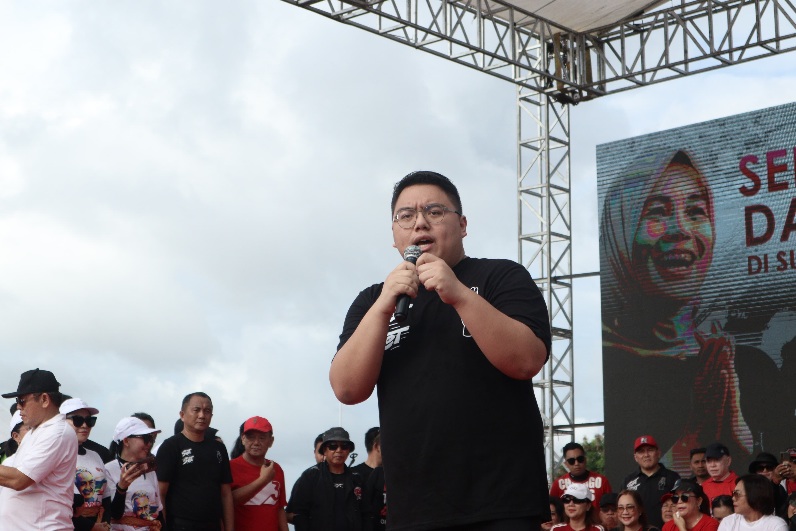 KORANMANADO.CO.ID- Ketua TPD Ganjar-Mahfud Sulawesi Utara (Sulut) Rio Dondokambey hadir dan berorasi di Kawasan Pohon Kasih Megamas menyambut kedatangan calon Ibu Negara Siti Atikoh istri Capres Ganjar Pranowo, Sabtu (17/1/2024) pagi tadi.